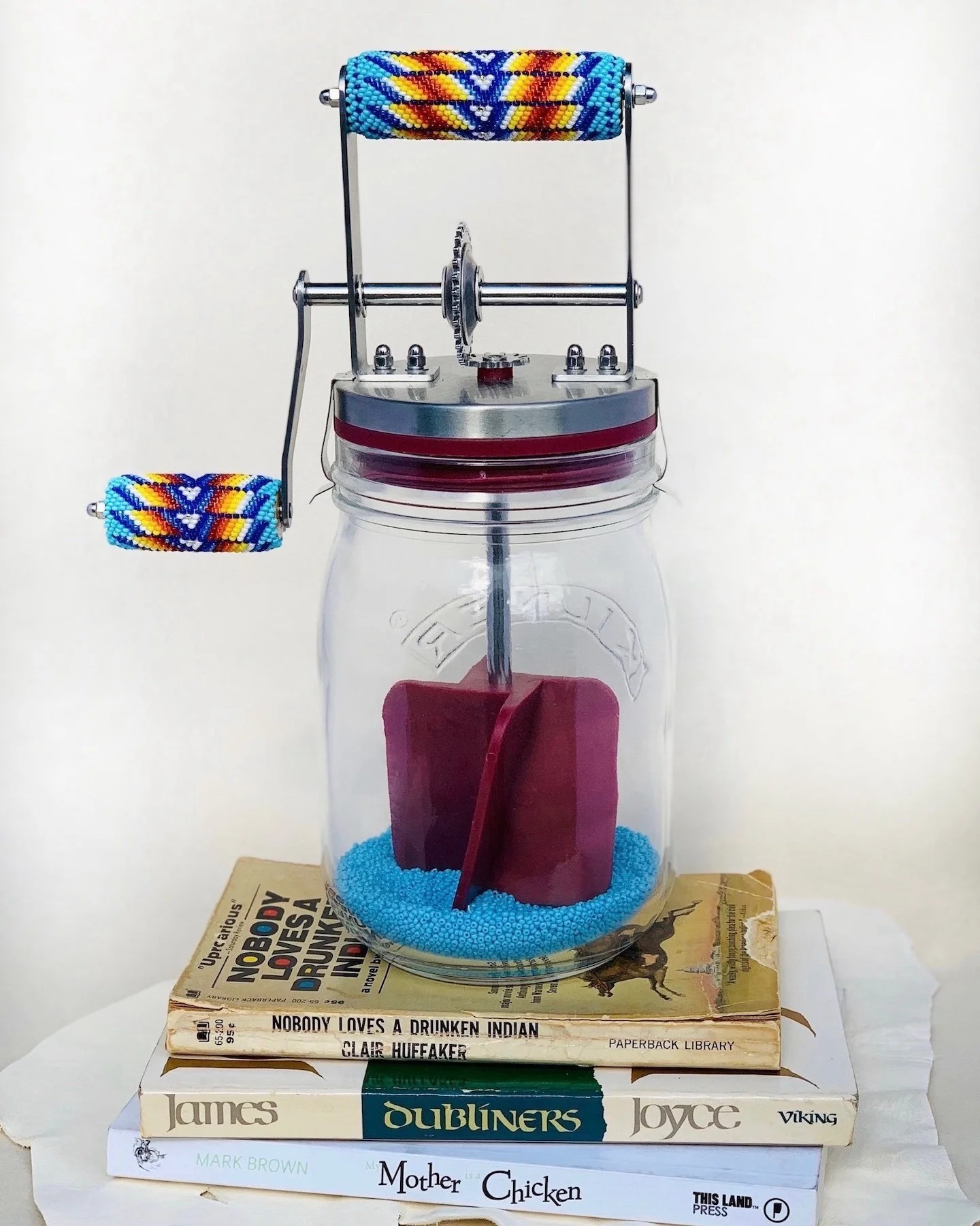 At the opening of “In the Spirit” the community contributes to this piece by telling a story in it’s presence while holding loose beads, pouring them in and turning the handle to complete the piece that is Our Stories Are Mixed.